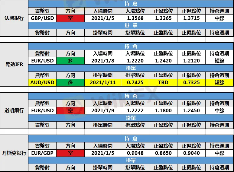 (1)路透IFR新建澳元/美元多頭掛單,掛單點位0.7425,止盈點位暫未設定,止損點位0.7325。