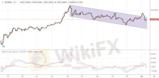 黃金方面,週三(1月13日)亞市早盤現貨黃金延續昨日的回升之勢,再度走高,目前暫報1857.24美元/盎司。由於美元和美國國債收益率回落,助力黃金止跌反彈,上逼1860關口。