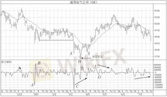 最後,在價格柱形圖中的最低價位點,一個袋鼠尾的形態展現出來。結合各種形態模式,我們看出通用電氣公司股票的跌勢即將結束,上升的“號角”已經吹響了!但在D區域,價格由37美元向53美元挺進的途中,強力指標顯示出頂背離的狀態,預示著多頭的力量即將耗盡,果然在5月,股票價格的指數均線調頭向下,此一輪升勢結束。而此時的行情向多頭提供的是最後一次獲利的機會,你要平掉多單,反向做空。
