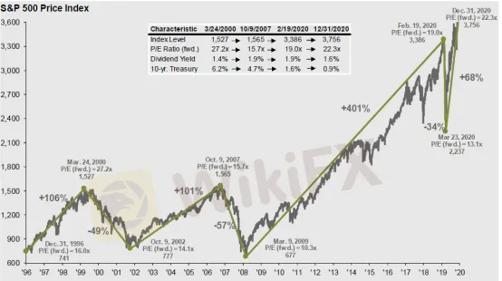 我們先來看一個“全景圖”,截止到2020年底標普500對應22.3倍市盈率,超過了2007年高點的15.7倍,但是低於2000年互聯網泡沫的27.2倍。另一方面,10年期國債收益率從2000年的6.2%下降到了今天的0.9%。在2020年標普一度暴跌34%,但是之後反彈了68%,指數繼續創歷史新高。