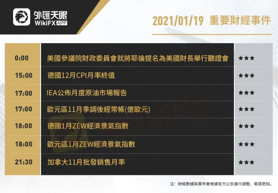 以下為1月19日(周二)重要財經事件,更多資訊,請關注外匯天眼APP或官方網站!