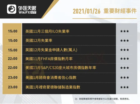 以下為1月26日(周二)重要財經事件,更多資訊,請關注外匯天眼APP或官方網站!