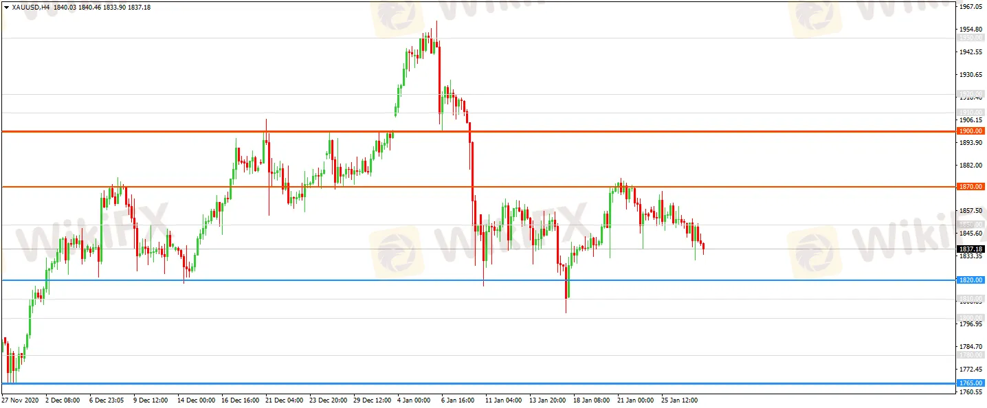 金價的走跌主要受累於美國刺 激計畫擔憂和美元走高。美)1.9萬億美元刺 激計畫規模相當大,分析人士不認為美國總統拜登有足夠的支持來通過該計畫。今日淩晨,美聯儲將指標隔夜利率維持在近零水準不變,同時保持每月購債規模不變,美聯儲再次承諾將保持這些支持經濟的舉措,直到經濟從大流行引發的衰退中全面反彈。但這種情況並沒有發生,美聯儲在政策聲明中指出,經濟復蘇的步伐可能在放緩。