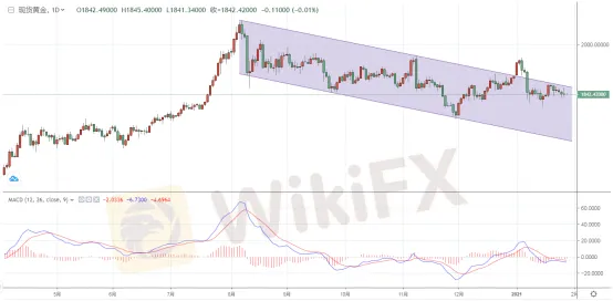 現貨黃金隔夜收報1843.02美元/盎司,下跌0.81美元或0.04%,盤中最高觸及1864.05美元/盎司,最低觸及1833.90美元/盎司。上周現貨黃金周線收漲27.16美元或1.49%。今天現貨黃金早盤延續近期的回落態勢,日內維持橫盤震盪,徘徊於1840關口,暫報1842.53美元/盎司。從近期的表現看,金價整體呈現出高位回落的格局,從趨勢看,金價反彈高點不斷被壓低,由於市場對於目前已知的風險已經麻木,致使黃金連續承壓回落。從圖中不難看出,金價通過1月4日的一根光頭光腳的大陽線方式突破了下行通道的束縛,此後持續上行,而在黃金錄得5連陽後,隨著市場避險情緒的降溫,金價持續遭受重創,而1月8日的一根大陰線直接跌穿關鍵支撐位置,致使金價重返下行通道內運行,此後就沒有再突破過,昨日雖然一度由於市場恐慌情緒推動金價上行,但是最終也是過山車行情,下方的MACD指標雖然顯示做空動能在逐步減弱,但是隨著不難看出空頭士氣仍然強勁,昨天的長上影陰線也是極有利的證明。(僅供參考)