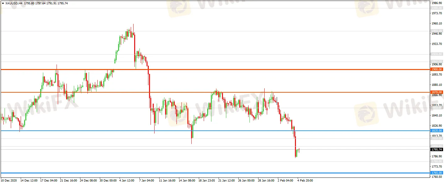 金價隔夜加速走跌破位1800美元/盎司,呈現疲弱態勢。從技術面上4小時級別圖上看,金價破位1820短期支撐,下方1765為前期關鍵強支撐,較為關鍵!