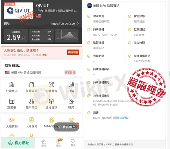 通過外匯天眼查詢可知,QIVIUT這個平台只擁有一個“NFA”授權的普通金融牌照,但已經屬於超範圍經營,表示QIVIUT並沒有從事外匯零售業務的資格。