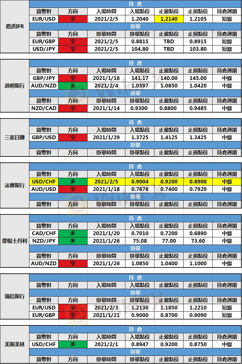 (1)法農銀行新增美元/瑞郎多頭持倉,入場點位0.9004,止盈點位0.9200,止損點位0.8900。