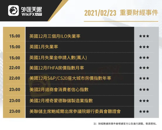 以下為2月23日(周二)重要財經事件,更多資訊,請關注外匯天眼APP或官方網站!