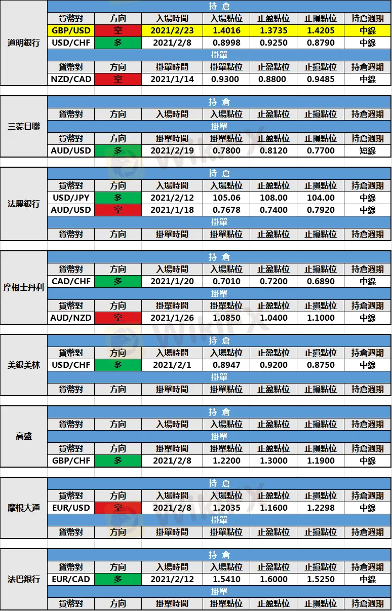 (1)道明銀行新增英鎊/美元空頭持倉,入場點位1.4016,止盈點位1.3735,止損點位1.4205。