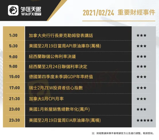 以下為2月24日(周三)重要財經事件,更多資訊,請關注外匯天眼APP或官方網站!