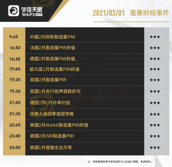 以下為3月1日(周一)重要財經事件,更多資訊,請關注外匯天眼APP或官方網站!