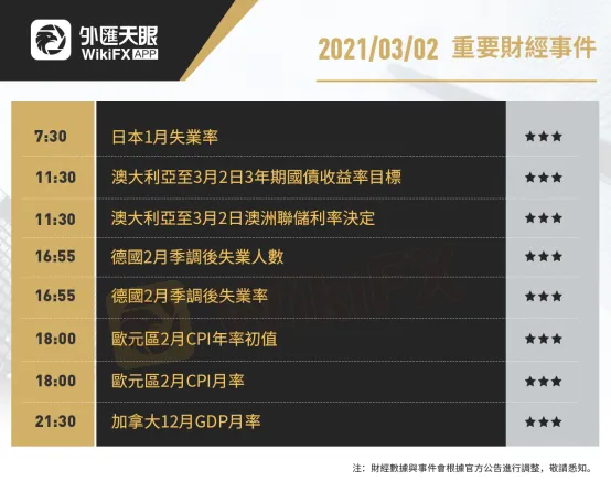 以下為3月2日(周二)重要財經事件,更多資訊,請關注外匯天眼APP或官方網站!