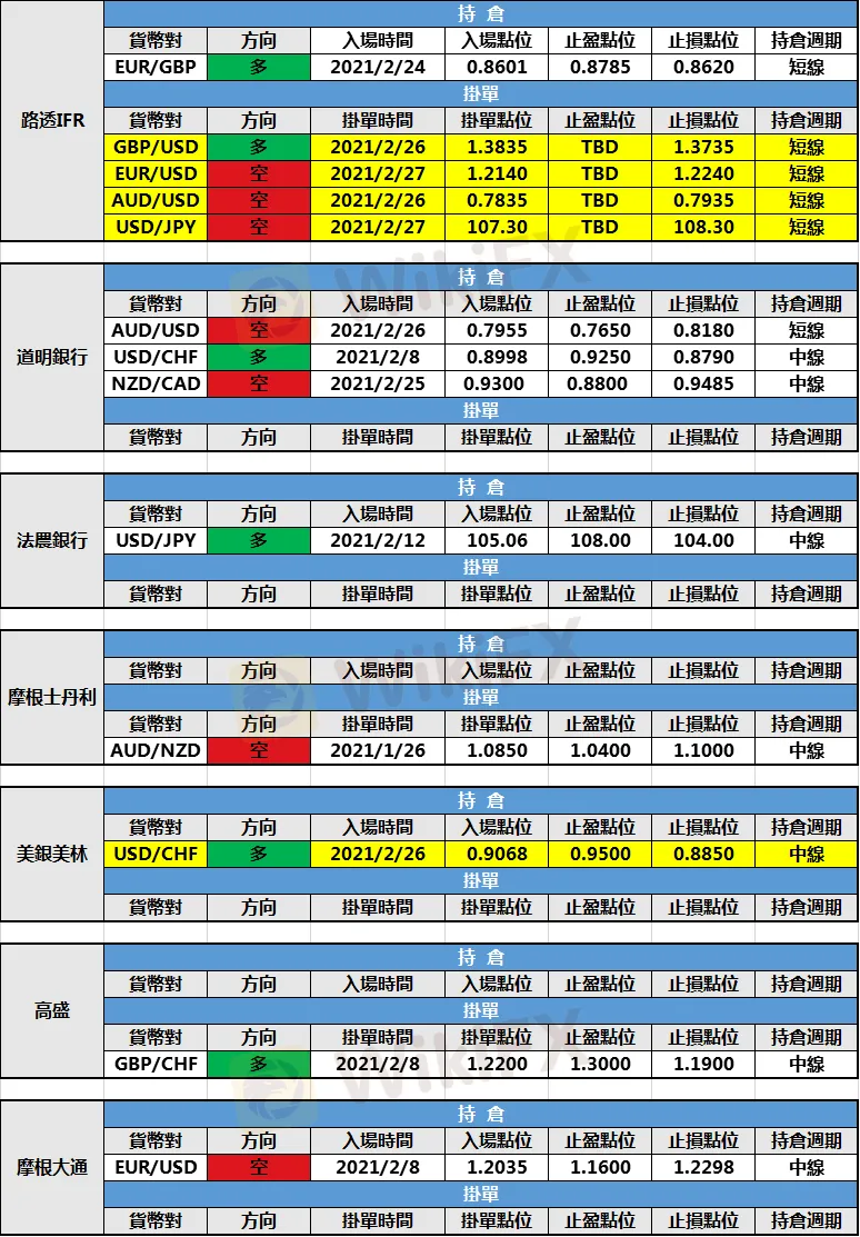 (1)路透IFR新建英鎊/美元多頭掛單,掛單點位1.3835,止盈點位暫無設定,止損點位1.3735;新建歐元/美元空頭掛單,掛單點位1.2140,止盈點位暫未設定,止損點位1.2240;取消澳元/美元多頭掛單,但又再次新建澳元/美元空頭掛單,掛單點位0.7909,止盈點位0.8065,止損點位0.7895;新建美元/日元空頭掛單,掛單點位107.30,止盈點位暫無設定,止損點位108.30。