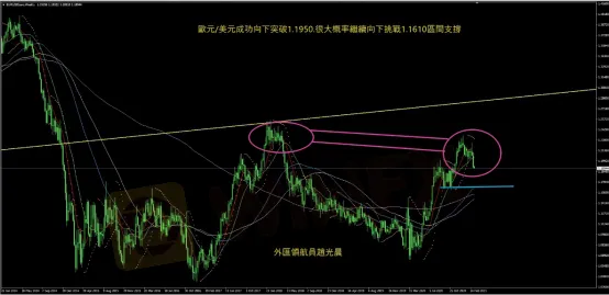歐元/美元上周K線收長陰K成功突破20週均價與1.1950支撐.很大的概率繼續向下挑戰1.1610支撐.