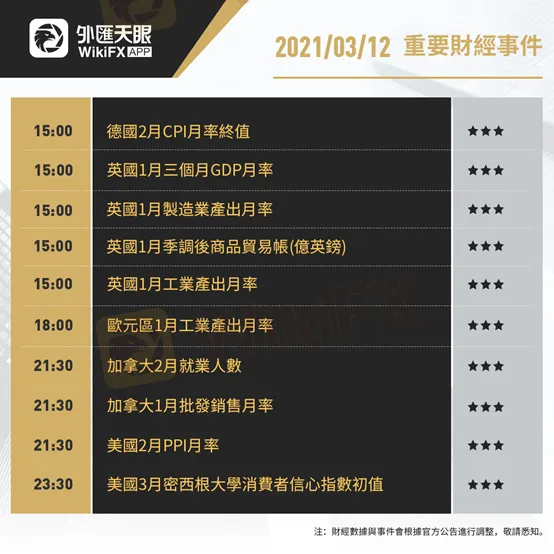 以下為3月12日(周五)重要財經事件,更多資訊,請關注外匯天眼APP或官方網站!