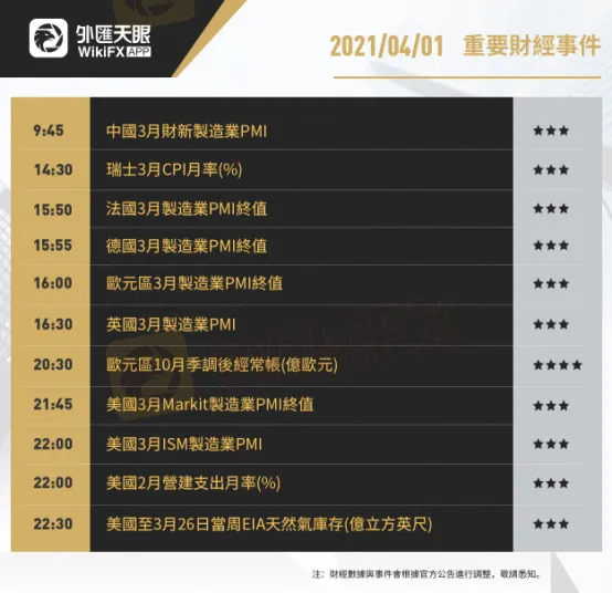 以下為4月1日(周四)重要財經事件,更多資訊,請關注外匯天眼APP或官方網站!