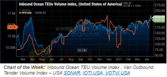 由於集裝箱進口量已與地面貨運量和運輸需求緊密相連,這同時散發出一個信號:美國本土地面運輸供應商在今夏將異常活躍。