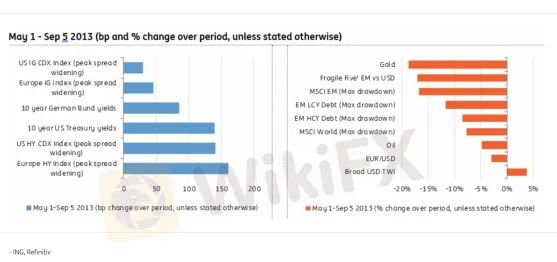 以史為鑒,荷蘭國際集團(ING Group)分析師回溯了2013年,也就是08年金融危機後美聯儲第四輪QE逐步退出時,全球市場巨震的情形:
