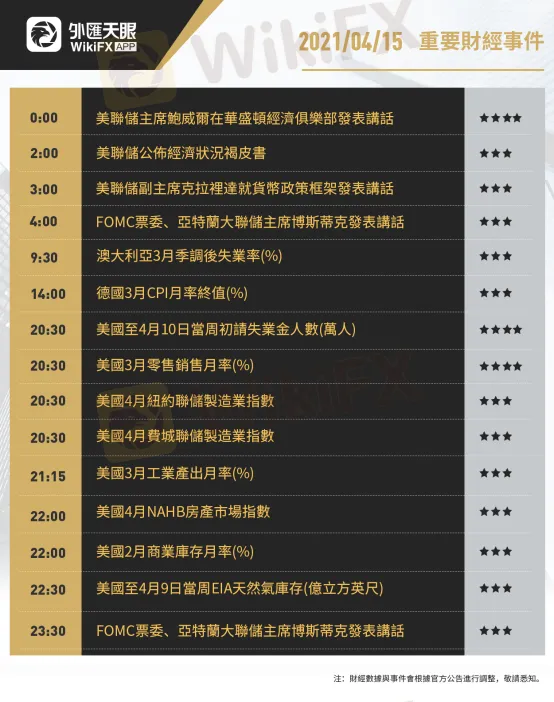以下為4月15日(周四)重要財經事件,更多資訊,請關注外匯天眼APP或官方網站!