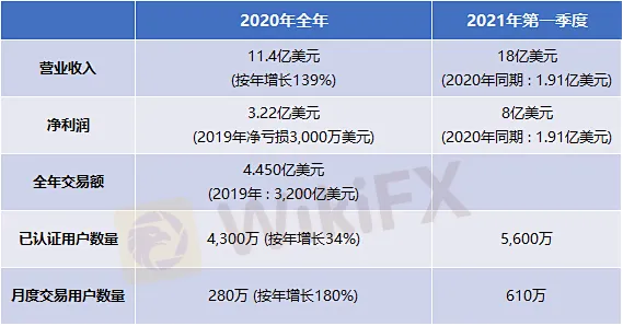 第一季度淨利潤將從去年的約3,200萬美元大幅躍升至8億美元。該公司補充說,第一季度已認證的用戶數量增長到5,600萬,月度交易用戶達到610萬,較2020年底增加了一倍多。