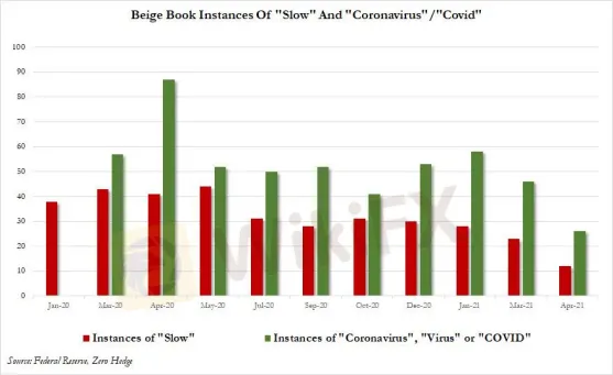 隨著經濟加速,這份報告中使用的緩慢(slow)一詞的次數降至12次,幾乎比上個月的23次減少了一半。同時,報告中提及新冠或病毒的次數也大幅下降,表明美國經濟已經為繼續復蘇做好準備。