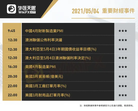 以下為5月4日(周二)重要財經事件,更多資訊,請關注外匯天眼APP或官方網站!