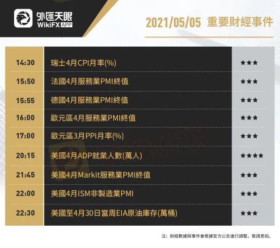 以下為5月5日(周三)重要財經事件,更多資訊,請關注外匯天眼APP或官方網站!