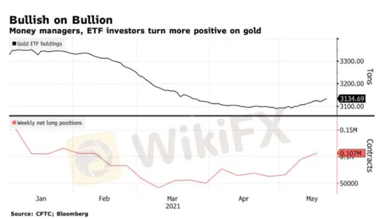 上周五公佈的數據顯示,對沖基金經理將黃金淨多頭頭寸增至16周來最高水準。彭博社收集的數據顯示,在金價連續三個月堅挺之後,5月份,黃金交易所交易基金出現資金流入。