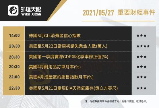 以下為5月27日(周四)重要財經事件,更多資訊,請關注外匯天眼APP或官方網站!
