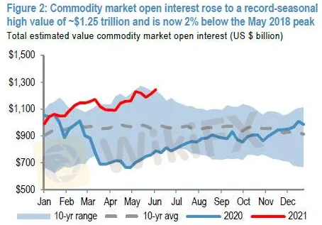 摩根大通預計,大宗商品市場未平倉合約周環比飆升約340億美元,達到季節性峰值的1.25萬億美元,僅比2018年5月的歷史峰值低2%。