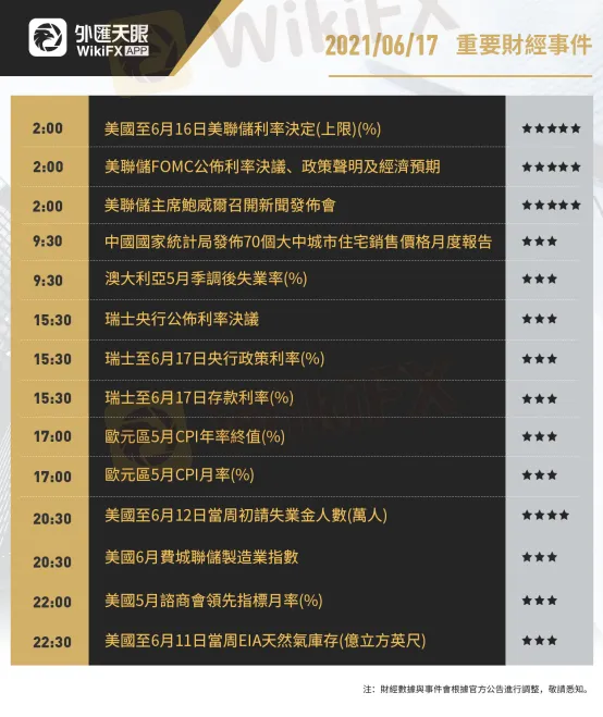 以下為6月17日(周四)重要財經事件,更多資訊,請關注外匯天眼APP或官方網站!