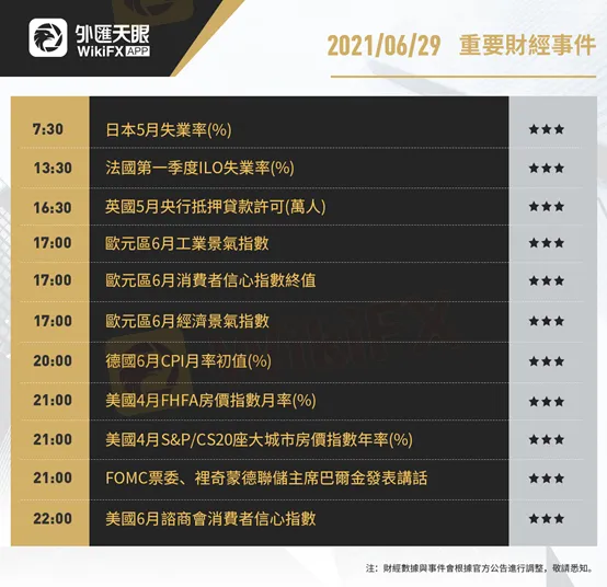 以下為6月29日(周二)重要財經事件,更多資訊,請關注外匯天眼APP或官方網站!