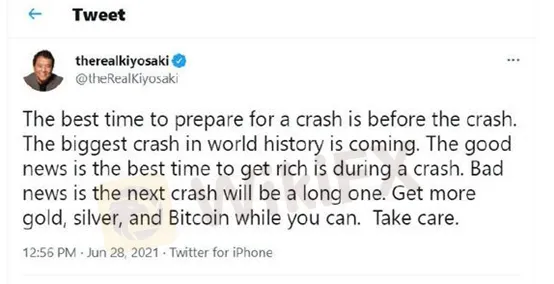 暢銷理財書《窮爸爸,富爸爸》的作者羅伯特·清崎週一寫道:“為崩 盤做準備的最佳時機是在崩 盤前。史上最大的崩 盤即將到來。好消息是致富最好時機就是在崩 盤期間,但壞消息是,下一次崩 盤將是漫長的。盡可能多地買入黃金、白銀和比特幣。祝好運。”