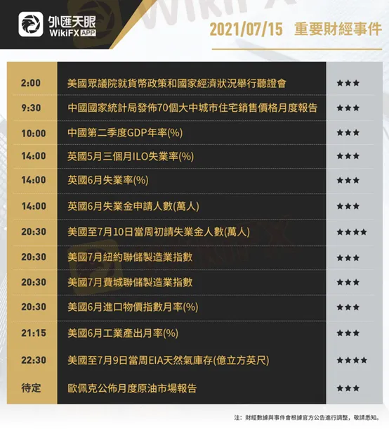 以下為7月15日(周四)重要財經事件,更多資訊,請關注外匯天眼APP或官方網站!