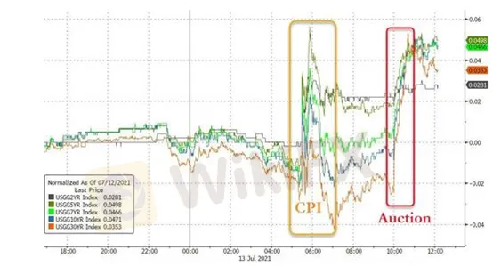 在過去一個月氣勢如虹的美債多頭,在隔夜終於遭遇了近幾周來最沉重的打擊。周二公佈的美國6月CPI數據創下13年最大的同比漲幅,顯示通脹壓力持續增大。而當天晚些時候進行的30年期美債標售需求更是意外低迷。隨著美債多頭一夜連挨兩“悶棍”,各周期美債收益率周二紛紛大幅上漲。