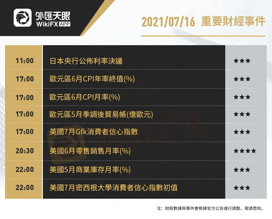 以下為7月16日(周五)重要財經事件,更多資訊,請關注外匯天眼APP或官方網站!