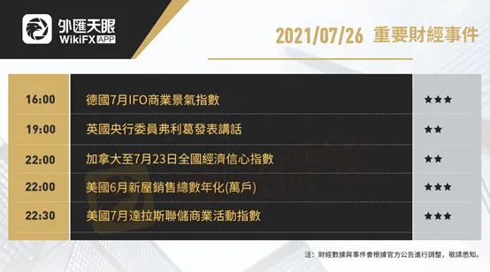 以下為7月26日(周一)重要財經事件,更多資訊,請關注外匯天眼APP或官方網站!
