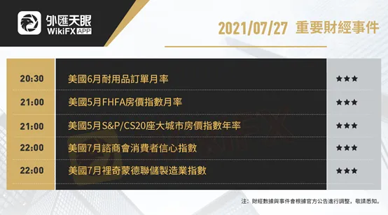 以下為7月27日(周二)重要財經事件,更多資訊,請關注外匯天眼APP或官方網站!
