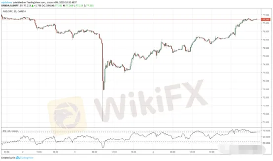事實也是如此,在澳元閃崩後的兩天裏,價格確實上漲了。澳元/日元在那一周收於77.213,比閃崩前幾個小時的平均價格高出約150個點,也就是說兩天內達到了驚人的620點。