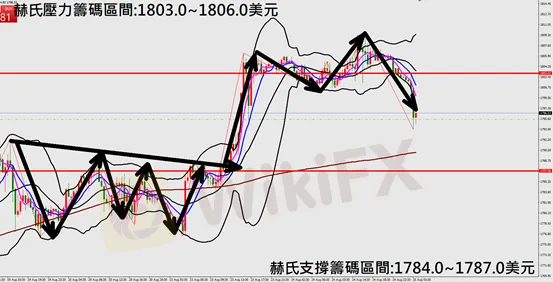 今日黃金(8月25日)早盤在1802.8美元/盎司附近,從技術分析面切入1小時級別觀察走勢架構符合昨日(24日)預測K棒出現上漲行情,多單再次獲利入袋,隨後高點遇壓拉回修正,目前K棒呈現空方排列,同時布林通道開口轉折朝下,因此今日建議佈局空單為主。