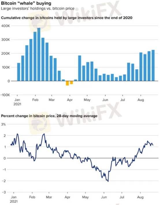 據區塊鏈公司Chainalysis的最新數據,自6月底以來,持有價值約5000萬美元或以上比特幣的加密貨幣帳戶的購買量穩步增加。隨著比特幣價格反彈至5萬美元以上,這種看漲情緒一直持續到8月底。