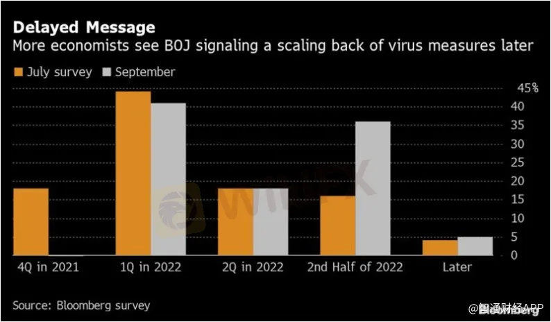 沒有經濟學家認為日本央行會在今年最後三個月縮減與疫情相關的措施,這一比例低於兩個月前調查中的18%。