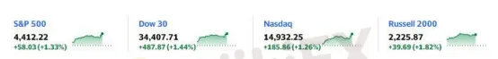 美股高開高走,金融和能源板塊領漲,道指和標普500指數均止步四連跌,分別從三個月和兩個月最低反彈。道指日內最高漲近500點或漲1.5%,重回3.4萬點上方,標普大盤最高漲1.3%,重回4400點,納指連漲兩日,最高漲超179點或漲1.2%,一度超過14900點。有分析稱,美股今日反彈幅度為7月以來最大,歐股也受到基礎資源和能源股提振。