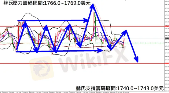 今日黃金(10月12日)早盤在1754.0美元/盎司附近,從技術分析面切入1小時級別觀察走勢架構昨日(11 日)K棒高點出現震盪行情,目前布林通道呈現縮口水平,如果跌破240日年線支撐,有望大幅下跌,因此建議布局空單為主。
