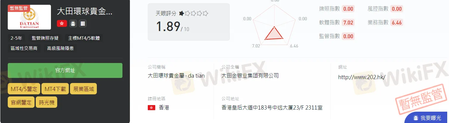 從天眼APP這邊可以看到該券商僅有1.89分,不僅網址註冊時間短只有2-年,也無任何牌照雖然有MT4/5交易系統但仍存在高級隱患!!