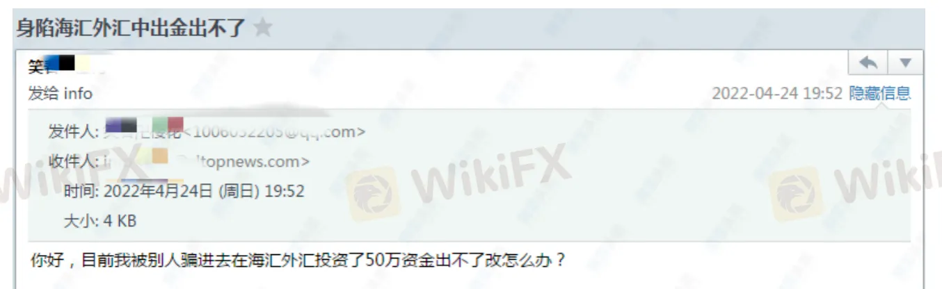 無獨有偶,今年3月份,也有投資者投訴稱在海匯出金遲遲不到賬,“我在2021年11月24在海匯國際申請出金,到現在沒有到賬,然後在2022年2月17日再次申請出金,這兩次都未到賬,期間通過郵件催促,也一直沒有回復。真是令人心塞的投資經歷,懇請能協助幫幫我們。”該投資者投訴到。