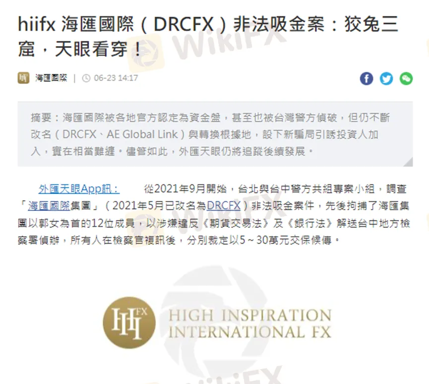 一直以來,資金盤海匯國際雖然被各地政府警告,卻不斷改頭換面持續行騙。外匯天眼在6月底時發布了「hiifx 海匯國際(DRCFX)非法吸金案:狡兔三窟,天眼看穿!」這篇文章,指出目前該集團並未消亡,而是改名為DRCFX與AE Global Link繼續運作。