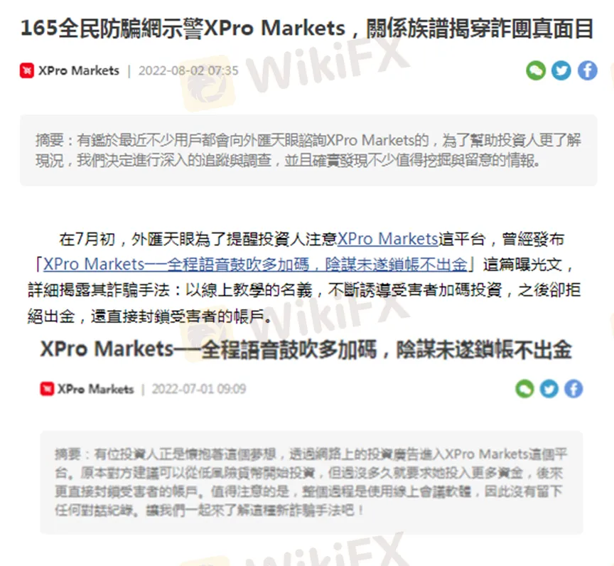 8/12,內政部警政署165全民防騙網最新公布的假投資(博弈)詐騙網站,其中仍有4件針對XPro Markets的通報,但其網址從之前的portal.xpromarkets.live,更改為xpromarkets.com,目前該網站仍正常運作中,尚未被列為詐騙網頁,呼籲投資人須多加留意。