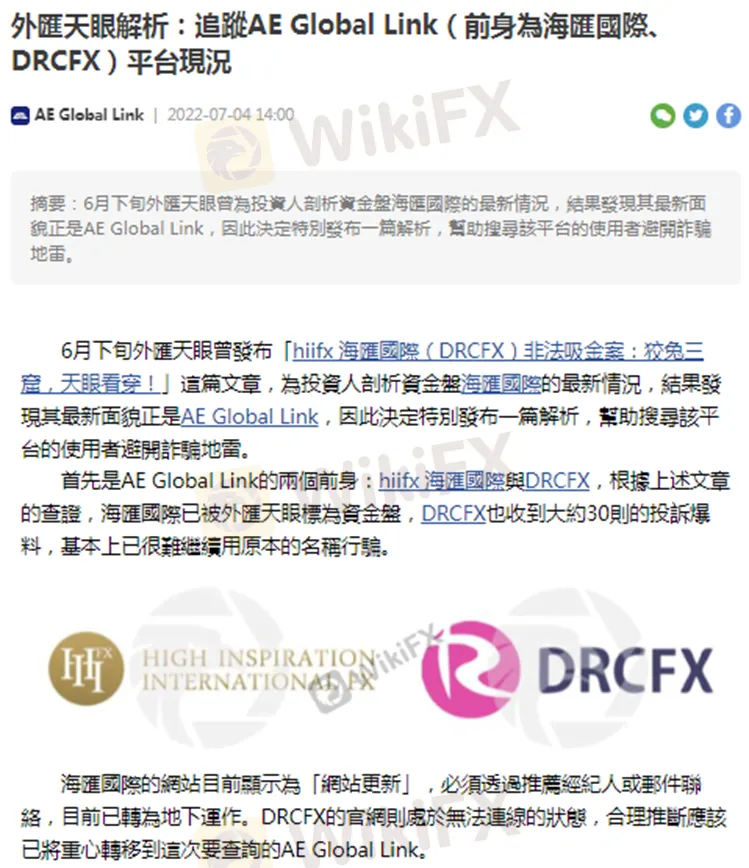 摘要:7月初,外匯天眼曾發布追蹤資金盤海匯國際的解析文,並且查到該集團有2個分身平台DRCFX與AE Global Link,呼籲投資人留意這個詐騙集團。如今1個多月過去,這些黑平台的受害者仍持續增加,有鑑於此,我們決定曝光海匯國際集團的最新動態。