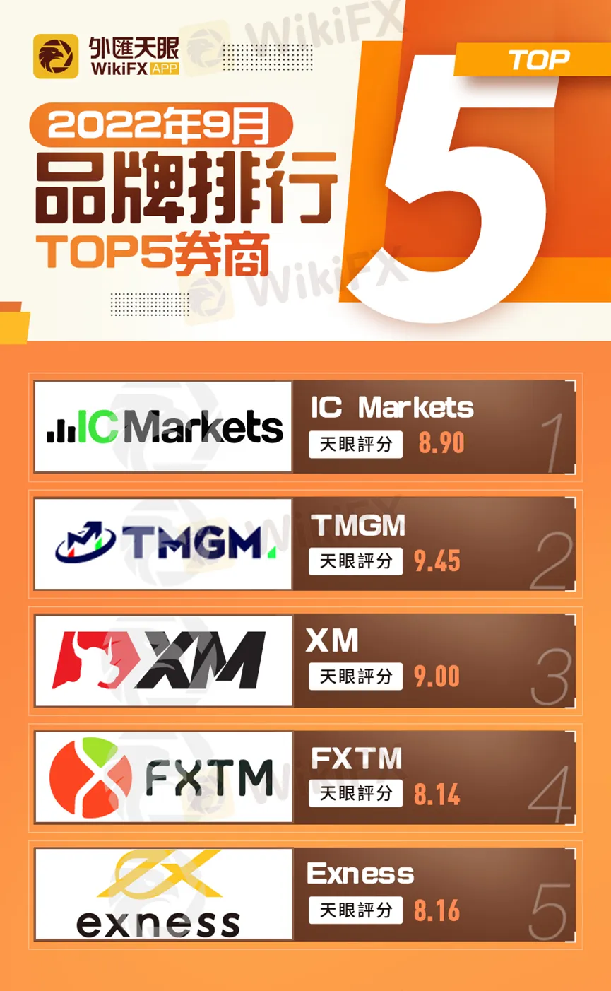 其實,外匯天眼官網有一個「天眼排行」功能,其中有按照綜合、品牌、交易、人氣等分類,幫助投資人按照本身的投資習慣與需求,找到心目中理想的經紀商。這次我們整理了2022年9月品牌排行TOP5券商,提供給所有用戶參考。